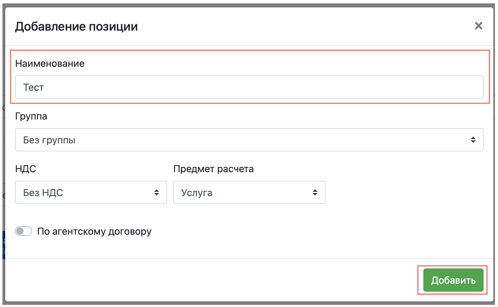 Заполните название позициции. Если необходимо заполнить данные Предмет расчета, НДС — выберите их.