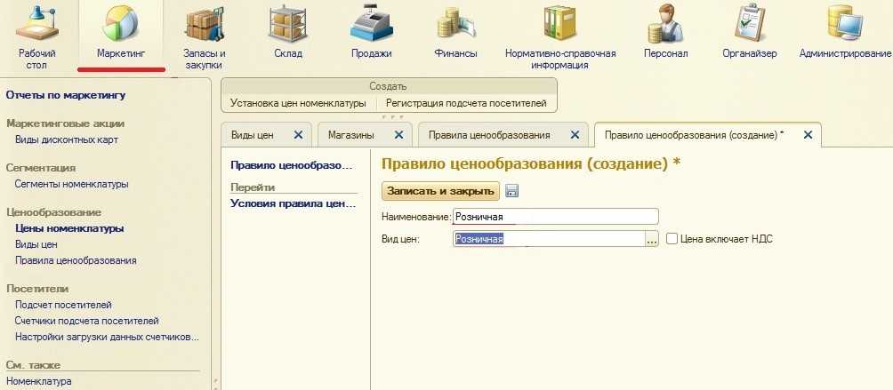 Перед нами появилось две цены: «Розничная цена» и «Закупочная цена». Следующий шаг – разрабатываем «Правила образования цен». Переходим в «Маркетинг», расположенный в навигационной панели. Выбираем раздел «Правила образования цен», жмем «Создать». В новом окне вводим «Название» и «Вид цен».