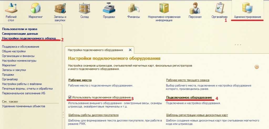Система РМК не может работать, если нет фискального регистратора. Следующий шаг – добавление фискального регистратора в систему. Здесь нужно добавить «Эмуляцию фискального регистратора». Заходим в раздел «Администрирование». Выбираем в навигационном меню «Настройку подключаемого оборудования». Выбираем с помощью галочки «Использовать подключаемое оборудование», переходим в «Подключаемое оборудование».