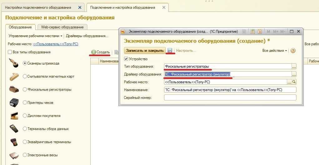 На данный момент список оборудования пустой. Мы добавляем новое оборудование. Клавиша «Создать», далее – «Тип оборудования». Выбираем фискальные регистраторы. Следующий шаг – «Драйвер оборудования». Напротив слов «Устройство используется» ставим галочку. После нажатия кнопки «Сохранить» опять переходим в настройки.