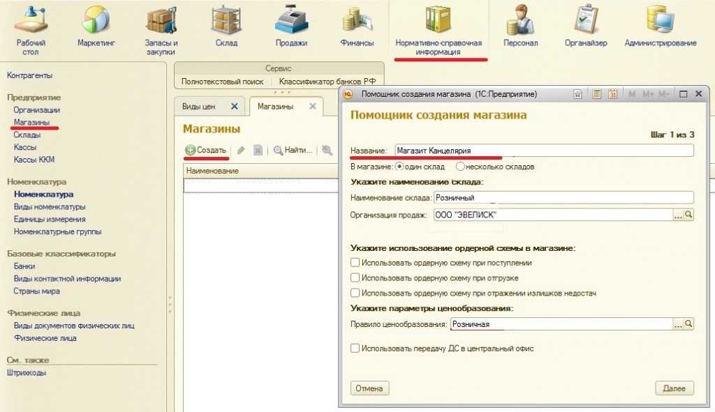 В программе 1С: Розница необходимо создать «Магазин». Он и будет продавать товары. Для этого переходим в «Нормативно-справочную информацию». На навигационной панели переходим в «Магазины». Жмем кнопку «Создать». Вводим главные реквизиты. Первый пункт – «Название». Работу можно выбирать в магазине либо с одним, либо сразу с большим количеством окладов. «Наименование склада», «Организация продаж» — это компания, с которой будут проводиться продажи. Наконец, выбираем «Правило ценообразования», жмем «Далее».