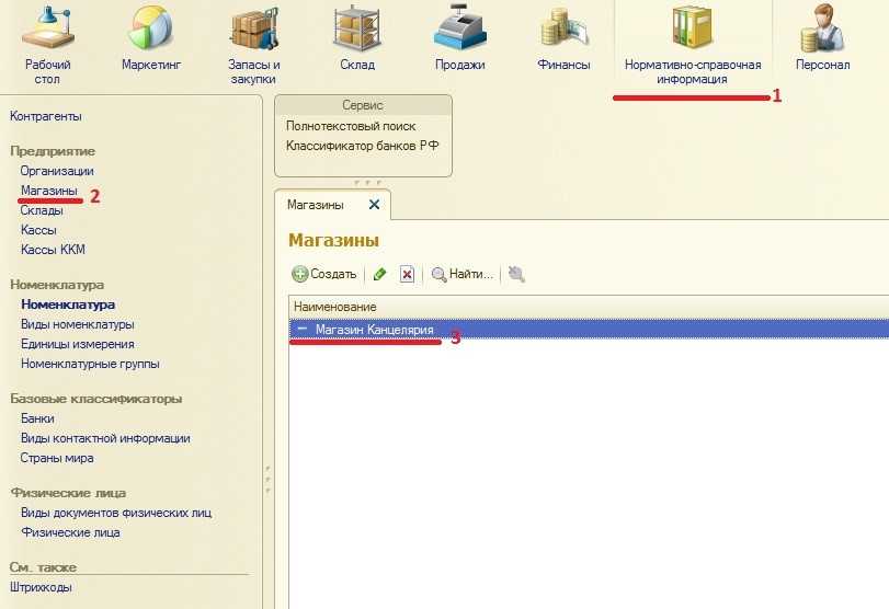 Настало время настраивать «Кассу КММ». Именно она и будет выбивать чеки. Для этого заходим в «Нормативно-Справочную информацию», потом – в «Магазины». С помощью двойного нажатия на клавишу открывается магазин компании.