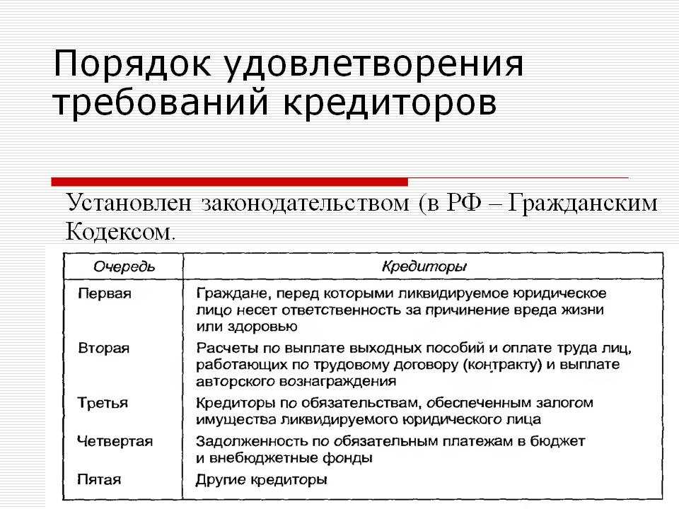 Сначала подлежат удовлетворению внеочередные требования кредиторов. Оставшиеся обязательства должника делятся на три очереди: