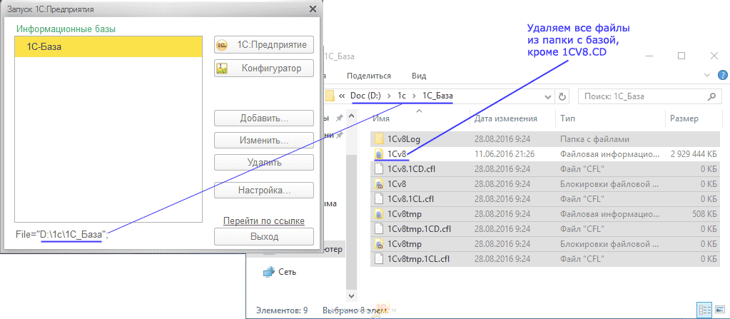 Для этого необходимо зайти в каталог, где хранится база данных 1С Предприятие 8.3 и удалить все файлы и папки, КРОМЕ ФАЙЛА ДАННЫХ 1Cv8.CD. Операция требует сноровки, поэтому будьте осторожны, не переборщите с удалением!