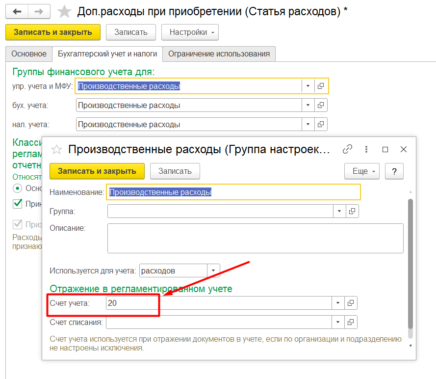 При этом на закладке «Регламентированный учет» указываем один из затратных счетов. Как правило, это 20 счет.