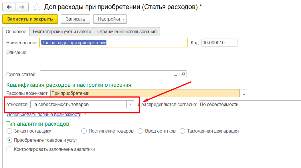 Выбираем тип расходов «При приобретении» или «Расходы на складское хранение и обработку». Распределение указываем «На себестоимость товаров».