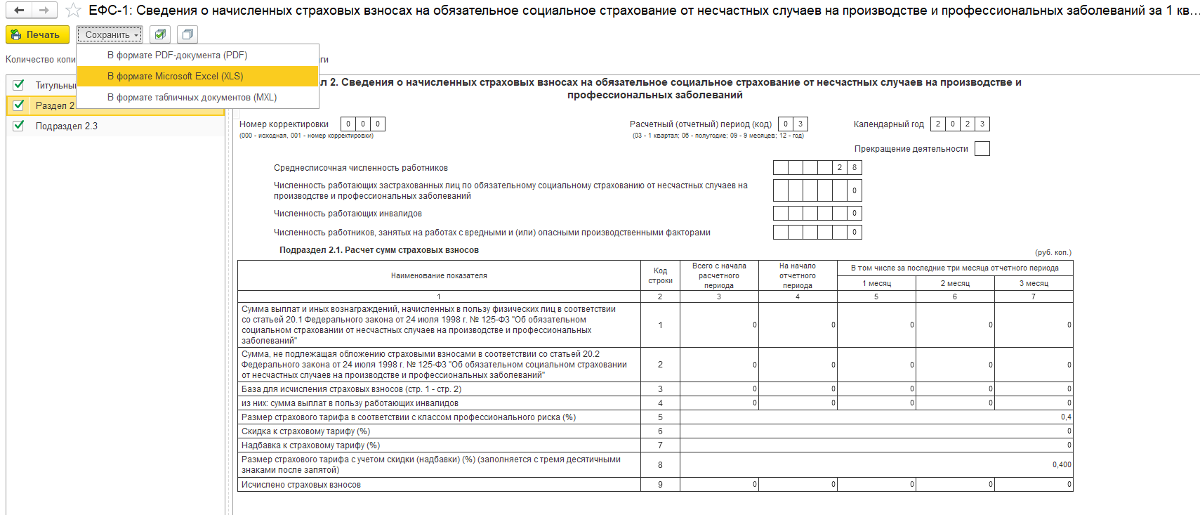 · Печать раздела 2 формы ЕФС-1