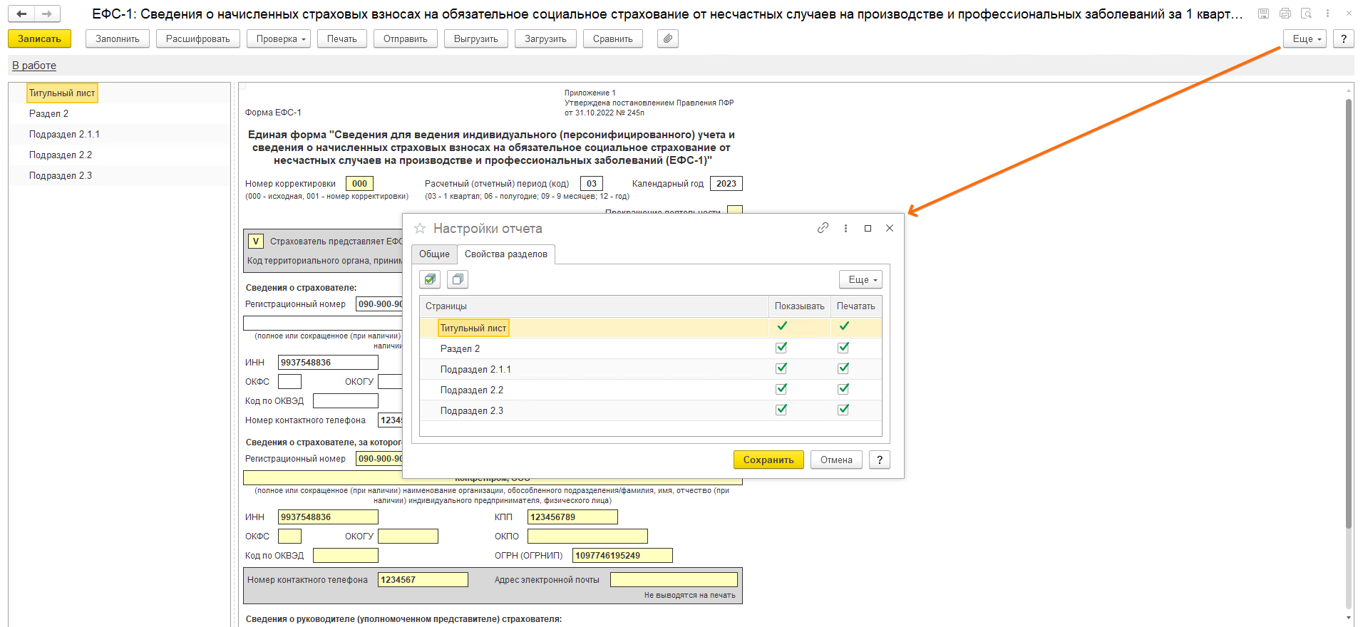 Настройка состава раздела 2 формы ЕФС-1